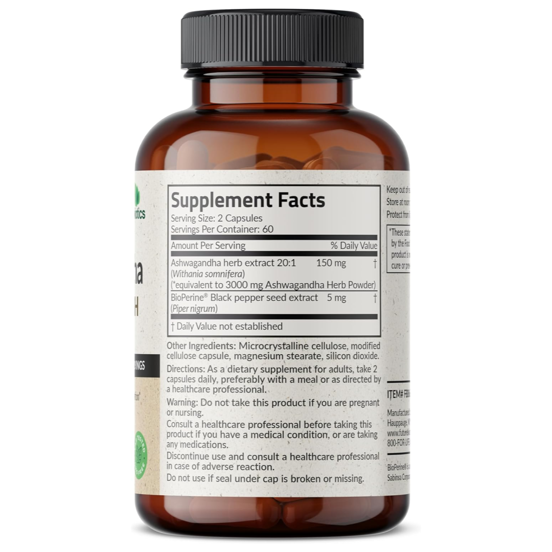 Herbal Stress Support: Ashwagandha Extra Strength helps to support a healthy stress response, maintain healthy cortisol levels, support a positive mood, and memory.* Futurebiotics Ashwagandha additionally includes BioPerine, which has been clinically shown to enhance nutrient absorption.*