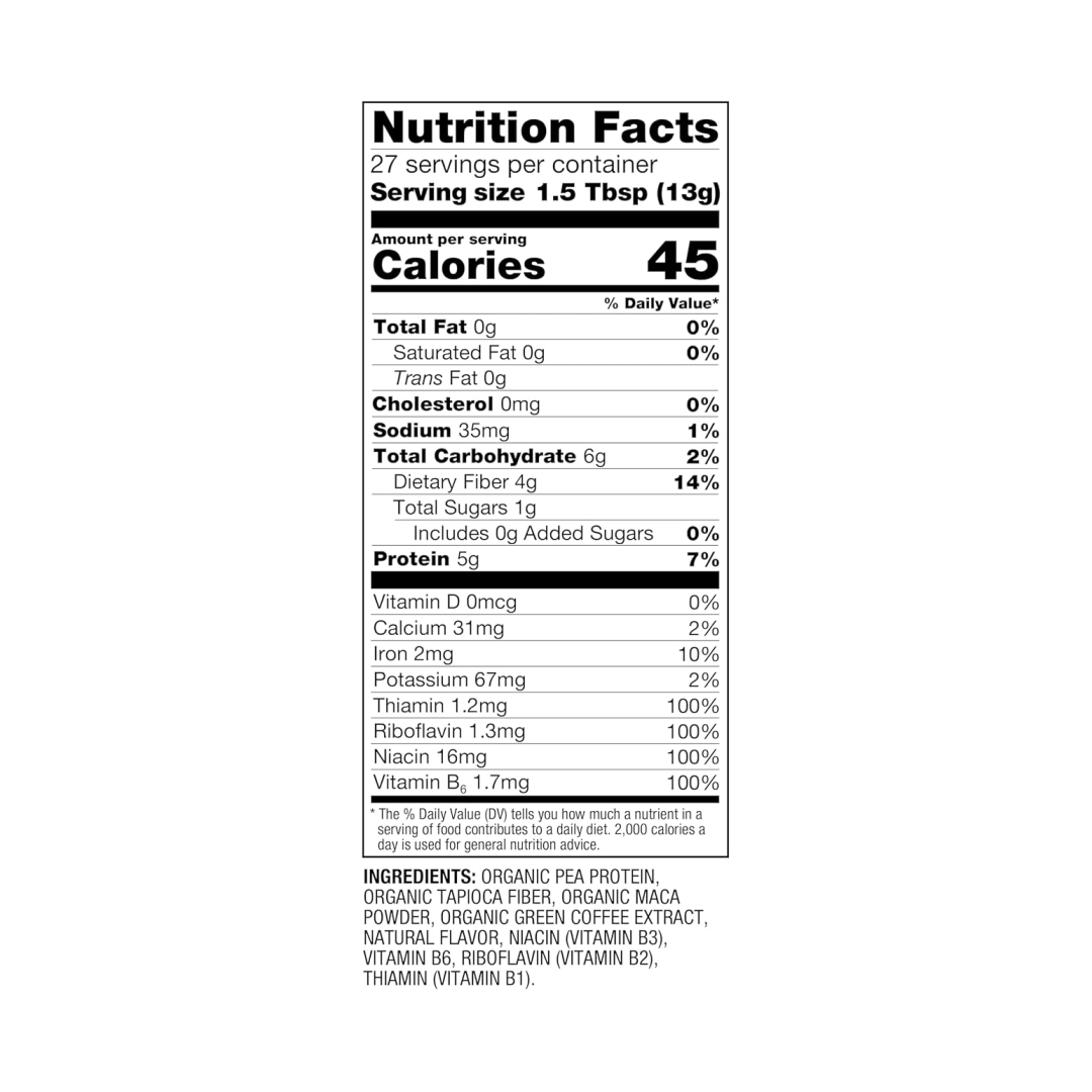 Natural Energy: like pea protein, maca powder, and green coffee extract, this Organic Energy Blend delivers 100% daily value of vitamins B1, B2, B3, and B6.