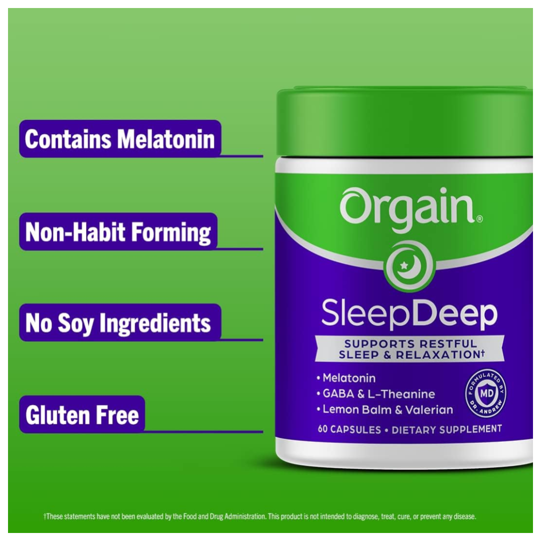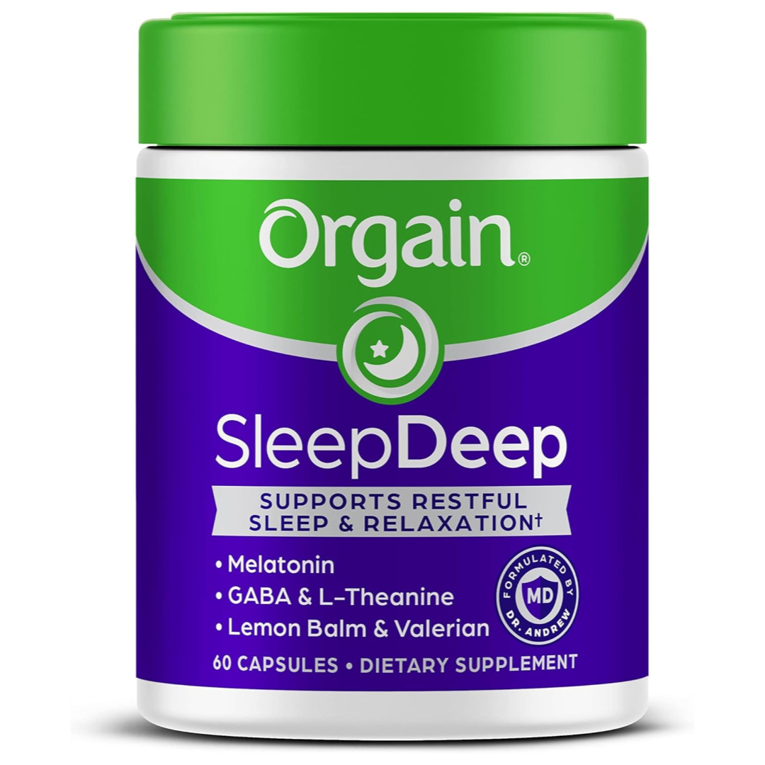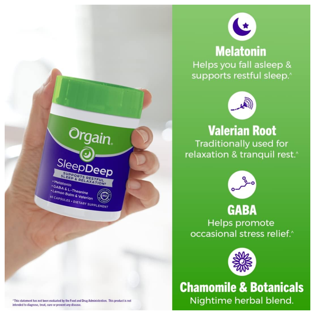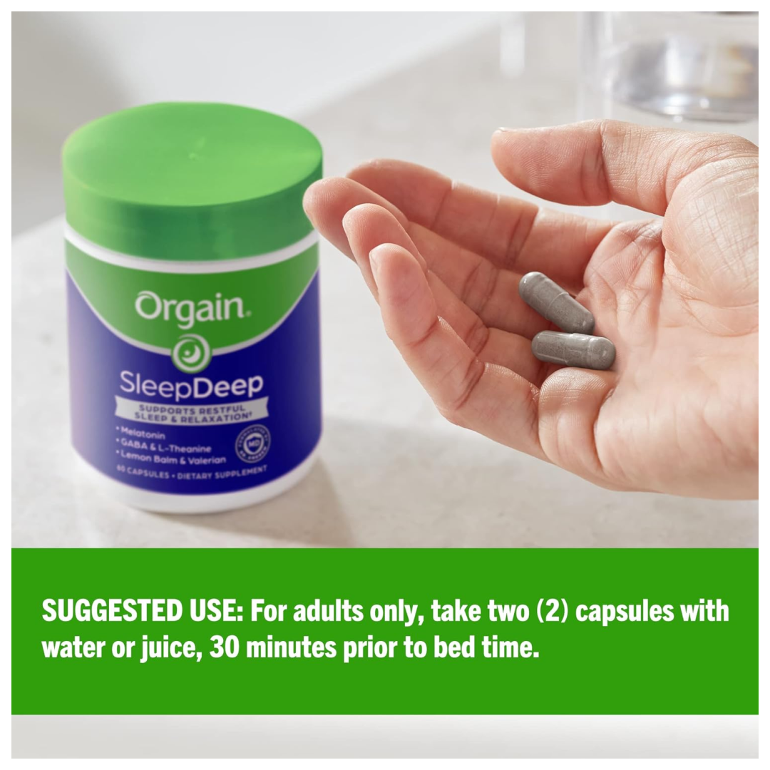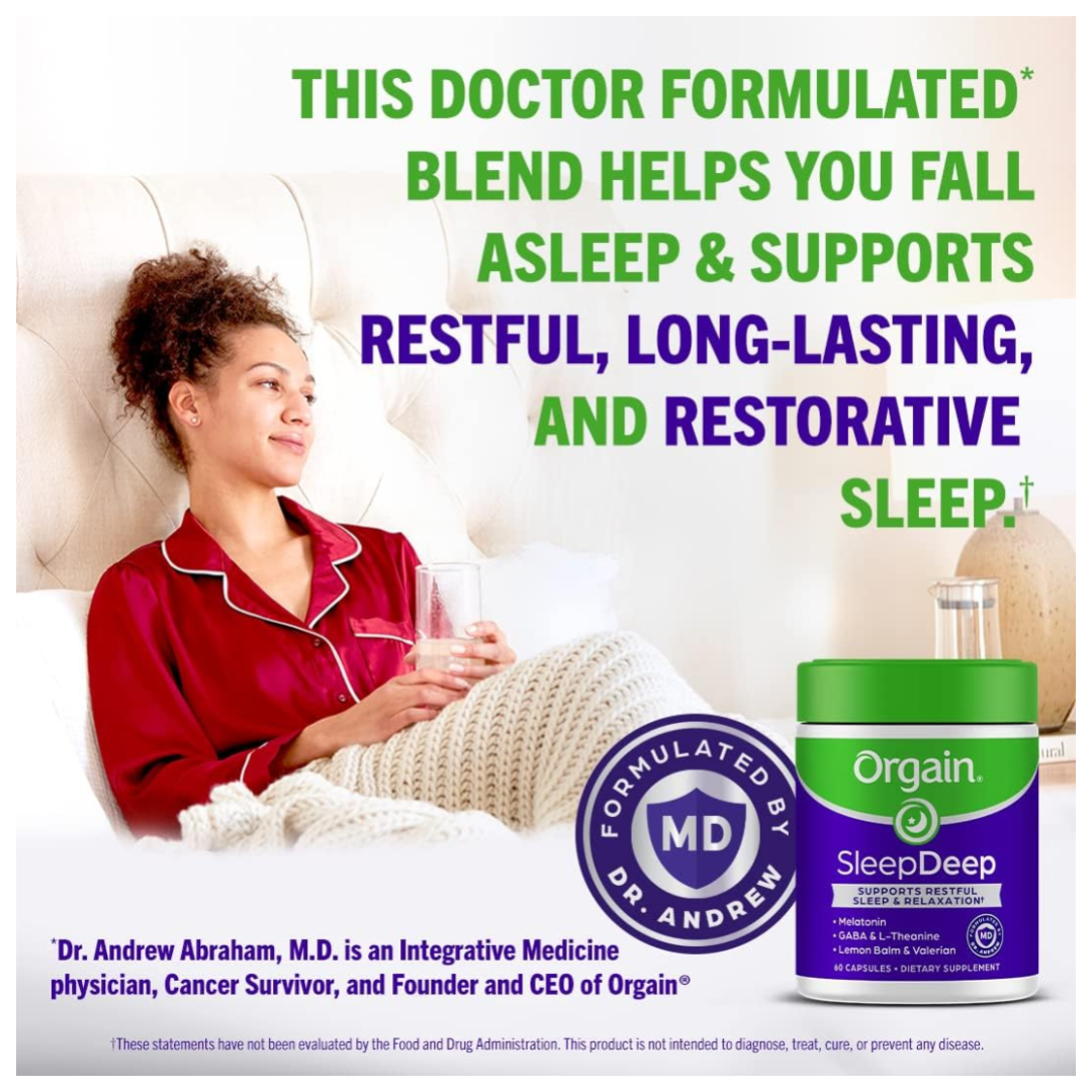 Orgain SleepDeep supports restful sleep & relaxation. Includes melatonin, GABA, and valerian root for restful sleep and relaxation, plus L-theanine, nighttime herbs lemon balm, chamomile, passionflower, and magnesium to support a good night’s sleep
